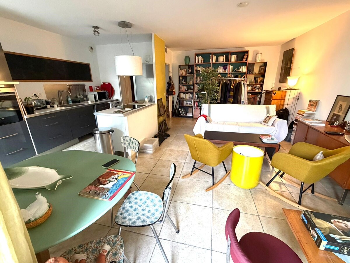Séjour avec cuisine semi ouverte, deux chambres, une salle de bain, wc séparé.